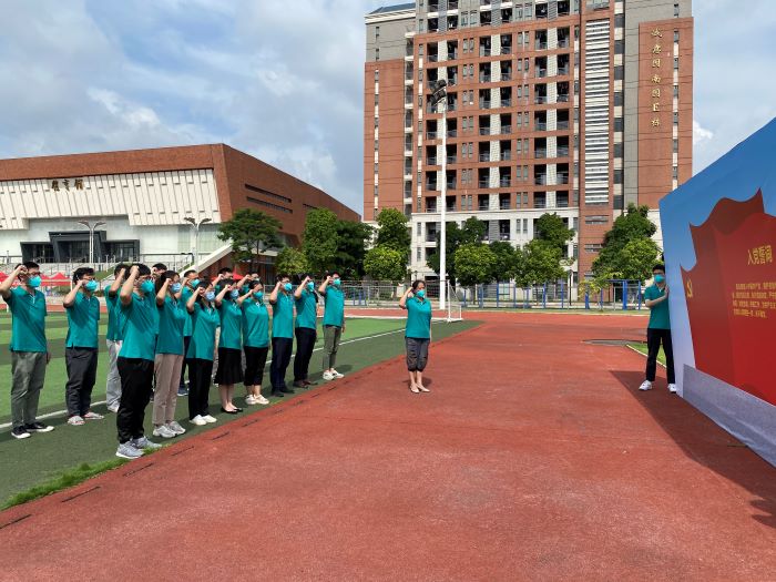 在支委的领导下,莞工支援队开展了扎实有效的工作,受到了省、市、校各方的充分肯定和认可。7月1日,正值中国共产党成立100周年,受广州新华学院党委的邀请,临时党支部书记苏亚玲、副书记陈泳源、宣传委员赵海峰作为代表,参加了“七一”升国旗仪式,在飘扬的国旗下,给现场的人群增添了一抹鲜亮的莞工绿。