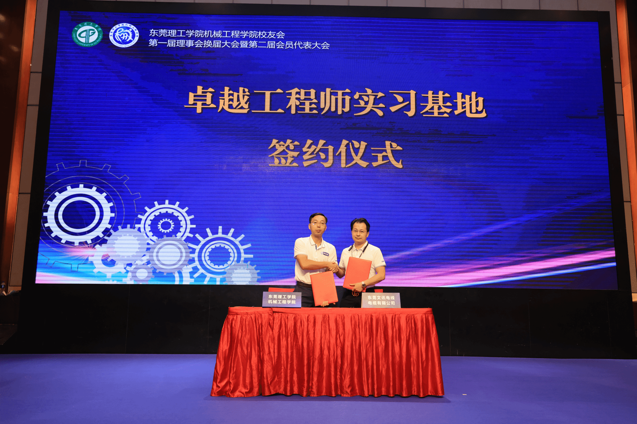 2002级机械专业校友、东莞文讯电线电缆有限公司副总经理周智聪,2007级级机械设计专业校友、东莞市瑾远智能装备科技有限公司总经理黄颖锋分别与机械工程学院副院长黄辉宇签订卓越工程师实习基地共建协议。通过卓越工程师实习基地打通产教融合“最后一公里”,努力培养出更多的能工巧匠、大国工匠。