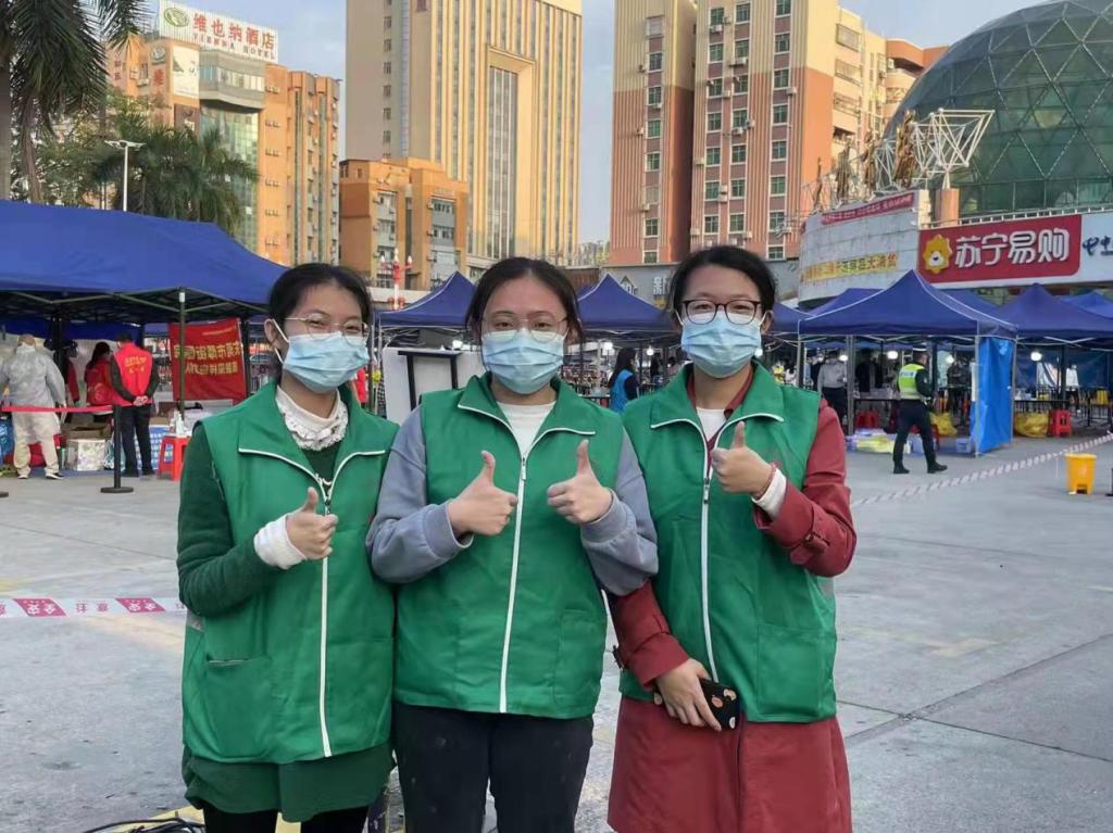12月20日,由于疫情被封控在大朗实验小学的2018级汉语言文学(师范)1班陈水婷、2018级小学教育(师范)1班王彩仪、袁淑盈三位实习生积极响应大朗镇教育系统疫情防控志愿服务队的组建,主动加入到大朗实验小学志愿服务队,并于12月21日和24日分别在大朗圣堂社区协助进行第六轮和第七轮大规模核酸检测工作。