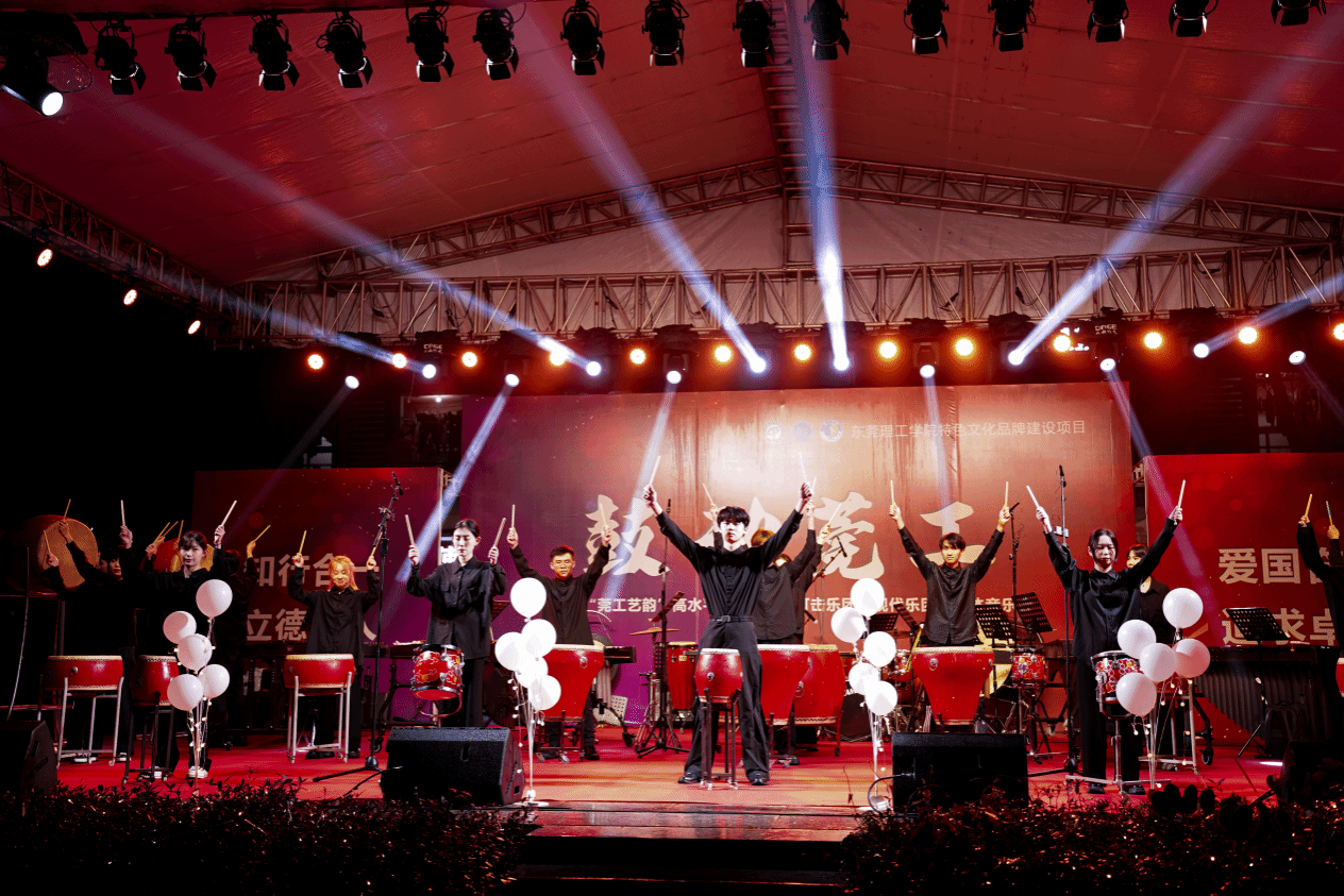 新学期伊始,“莞工艺韵”高水平文艺演出率先由打击乐团与现代乐团在校园亮相。3月31日,在松山湖校区学生社区知行广场采用现场演出同步线上直播的方式举办了主题为“鼓动莞工”的音乐会。音乐会精彩纷呈,气氛瞬间燃爆全场,为观众带来一场沉浸式的打击乐盛事。演出通过常规乐器、电声乐器及电子模拟音色的共同演奏,呈现出丰富的声部层次、立体的音响效果。当晚,乐团演奏《鼓动莞工》《碟中谍》《镜中花,水中月》等十二首曲目,用艺术的情感感染力、思想润物力、美学熏陶力、气氛渲染力,使观众们全方位、多角度领略了音乐的魅力,生动形象地展现了独具匠心的风格、多维的音响效果和引人入胜的表演。此次演出线下观众热烈反响,线上观看人数2700多人,点赞次数达12000次,得到了师生们广泛的赞誉及认可。