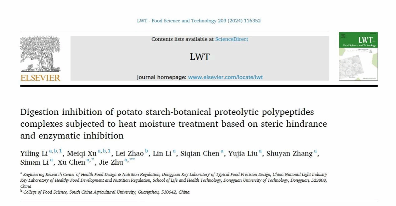 近日,我校生命健康技术学院朱杰教授团队在国际食品顶级期刊《LWT-Food Science and Technology》发表题为“Digestion inhibition of potato starch-botanical proteolytic polypeptides complexes subjected to heat moisture treatment based on steric hindrance and enzymatic inhibition”的研究性文章。该成果以九九精品视频一区在线久久久久久久久久毛片精品美女|国产99久久久久久免费看|中文精品99久久国产|国产69精品久久久久9999|精品久久久久久中文字幕无码|亚洲熟妇无码久久精品国产精品99|精品国产天堂综合一区在线为第一署名单位,九九精品视频一区在线久久久久久久久久毛片精品美女|国产99久久久久久免费看|中文精品99久久国产|国产69精品久久久久9999|精品久久久久久中文字幕无码|亚洲熟妇无码久久精品国产精品99|精品国产天堂综合一区在线生命健康技术学院联合培养硕士研究生李益玲为第一作者、徐美琪为共同第一作者,朱杰教授和陈旭副教授为通讯作者。